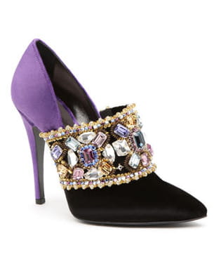 Voilà un modèle à tomber à la renverse ! Tout en velours noir et soie violette, il est serti de mille pierres au niveau du cou de pied. Qui n'a jamais rêvé d'avoir un trésor à ses pieds ?