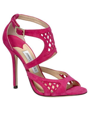 Issue de la collection Croisière 2010 de Jimmy Choo, cette sandale en veau velours fuchsia a tout pour plaire. Un talon fin vertigineux, une ouverture qui dévoile les orteilles et un motif ajouré, tellement tendance cet été.