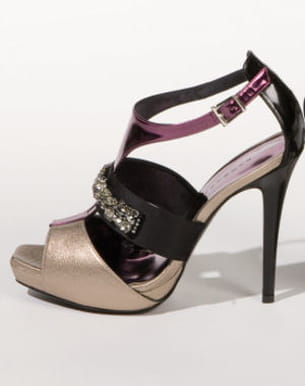Des strass, du cuir métallisé or et rose et du cuir verni noir : autant de détails qui confèrent à ce modèle une allure très glam'rock.