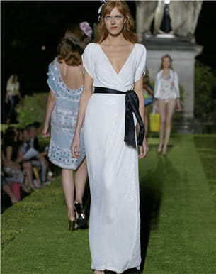 Façon cache-cœur, cette robe allie la pureté du blanc à reflet argenté au charme d'un ruban noir. Très chaste par sa longueur, ce modèle se fait sexy avec son décolleté profond. Pour ressembler aux stars hollywoodiennes des années 1930.