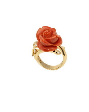 Inspirée de la fleur fétiche de monsieur Dior, la bague Gwendoline est surmontée d'une rose en corail taillé à la main et posée sur la tige en or jaune. On se pique volontiers le doigt à ce modèle signé Victoire de Castellane.