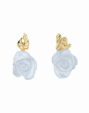 Mignonne, allons voir si la rose... Ces boucles s'épanouissent à nos oreilles pour une touche florale et précieuse. Avec leur délicat coloris neige, elles évoquent un jardin d'hiver qu'une abeille d'or et de diamants n'hésite pas à venir réchauffer.