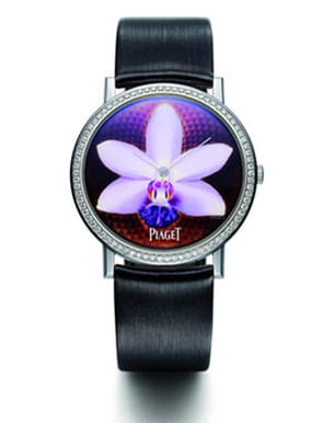 En tant que maison de tradition, Piaget souhaite préserver et développer les métiers d'art de la haute horlogerie, et notamment celui des artisans maîtres émailleurs. Ces derniers ont orné, avec une finesse inouïe, les cadrans et boîtiers de la collection "Piaget Altiplano" de sublimes orchidées, selon la technique de la miniature. Profitant de la taille généreuse du cadran, les pétales se déploient sur toute la surface dévoilant ainsi le jeu des coloris et la finesse des nervures. Tous uniques et nécessitant plus d'un mois de travail, ces cadrans prennent place dans des boîtiers en or blanc 18 carats sertis de diamants taille brillant. A l'intérieur : le mouvement mécanique Piaget à remontage manuel ultra-plat 430P, qui fait la fierté de la maison.