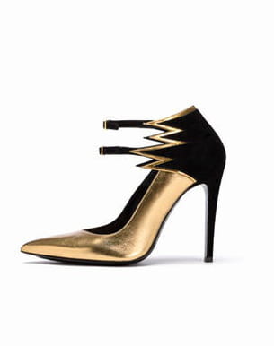 Ces escarpins enflamment le monde de la mode avec leur effet laminé. Ils allient avec talent le noir et le doré pour un résultat très chic mais aussi vertigineux puisque le talon culmine à 12 cm.
