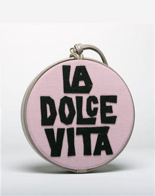 La créatrice, réputée pour ses fameuses minaudières façon livres, nous fait vivre la "dolce vita" avec ce sac à message. Une forme ronde et un design original, il n'en fallait pas plus pour le désirer au plus vite à notre bras.