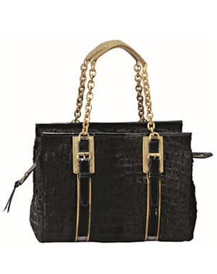 Tès chic par sa forme, ce sac associe un cuir de veau fourrure gaufré à des détails dorés et vernis. Un duo audacieux mais qui fonctionne plutôt bien et qui s'inscrit parfaitement dans la tendance baroque qui remet le doré à l'honneur.