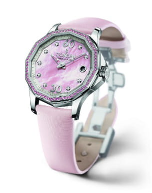 Une montre tout de rose vêtue pour afficher sa féminité ! Son cadran en nacre à la forme graphique fait son originalité.