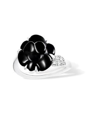 Androgyne et ambigu, le camélia a une image de fleur interdite qui résonne avec le goût de Mademoiselle Chanel pour la provocation. Devenu l'emblème de la maison, il se décline dans la collection du même nom de Chanel Joaillerie. A l'image de cette fine bague en or blanc, onyx et diamants, d'un chic absolu.