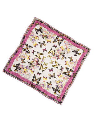 Antonio Marras pour Kenzo vous amène dans la folle course d'Alice au pays des merveilles ! Pour la saison printemps-été 2009, la marque vous propose de ravissants foulards inspirés de deux chapitres du livre de Lewis Carroll : le jardin des fleurs vivantes et les conseils d'une chenille. En voici un, en voile de soie et satin, laissant virevolter des papillons colorés à souhait pour toujours plus d'originalité. Ultra poétique.
