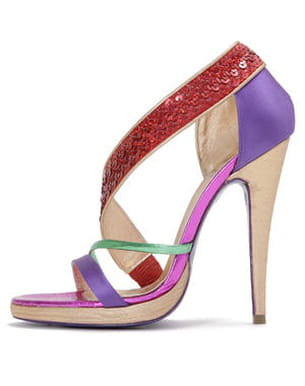 Saison printemps-été oblige, les couleurs sont plus que jamais de sortie. Avec ses brides violettes, vertes et rouges à paillettes, cette sandale à talon doré signée Viktor and Rolf ne peut que séduire ces dames éprises de tonalités chamarrées.