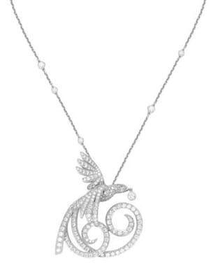 Une légende raconte que l'Oiseau de Paradis flotte dans les airs et ne redescend jamais sur terre. Il se nourrit de la rosée du ciel. Amoureux accompli au plumage flamboyant, il parade avec grâce et raffinement. Porteur de mystère, de mythes extravagants et légendes énigmatiques, il invite au rêve et à l'évasion. Libre et insaisissable, il inspire aujourd'hui Van Cleef & Arpels qui retranscrit sa beauté majestueuse et délicate dans une collection lumineuse, stylisée et aérienne. Ainsi, ce pendentif en or gris serti de 277 diamants retient-il un oiseau en plein vol dont les plumes forment de délicates arabesques entremêlées.