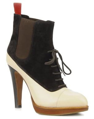 Chez Fred Perry cette saison, on revisite les bottines façon richelieu. Tout en cuir et velours, en mode bicolore et montée sur ses onze centimètres de talon, cette paire résolument tendance nous fait aussi une silhouette de rêve. Sans compter qu'elle reste aussi des plus confortables avec sa semelle en gomme et cuir : bref, au top pour les princesses actives ! Collection automne-hiver 2011-2012