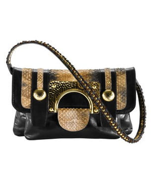 Voilà un modèle de sac qui devrait nous suivre dans toutes nos soirées. Petit par sa forme, il se faire remarquer par les multiples détails qui le décorent. Le cuir noir est surmonté d'empiècements en python véritable et en métal doré, et l'anse parsemée de clous dorés. Une bien jolie pochette qui devance les tendances.