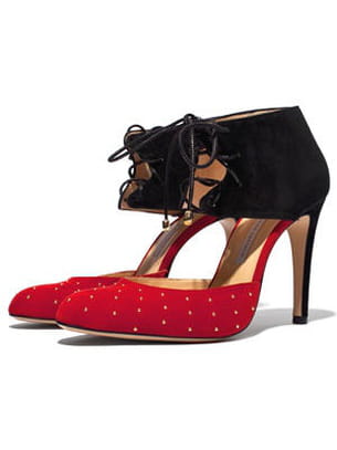 Escarpins en cuir façon daim noir et rouge et petits clous dorés, talon de 10 cm