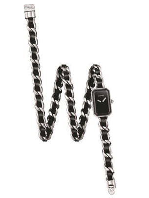 Montre "Première Triple Tour", bracelet chaîne triple tour en acier entrelacé de cuir noir, boîte en acier cadran laqué noir, mouvement quartz de haute précision.