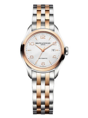 Montre "Clifton" 30 mm automatique, bicolore, cadran argenté. Or rouge massif sur la lunette en acier et deux des cinq maillons du bracelet en acier à maille souple. Calibre mécanique à remontage automatique.