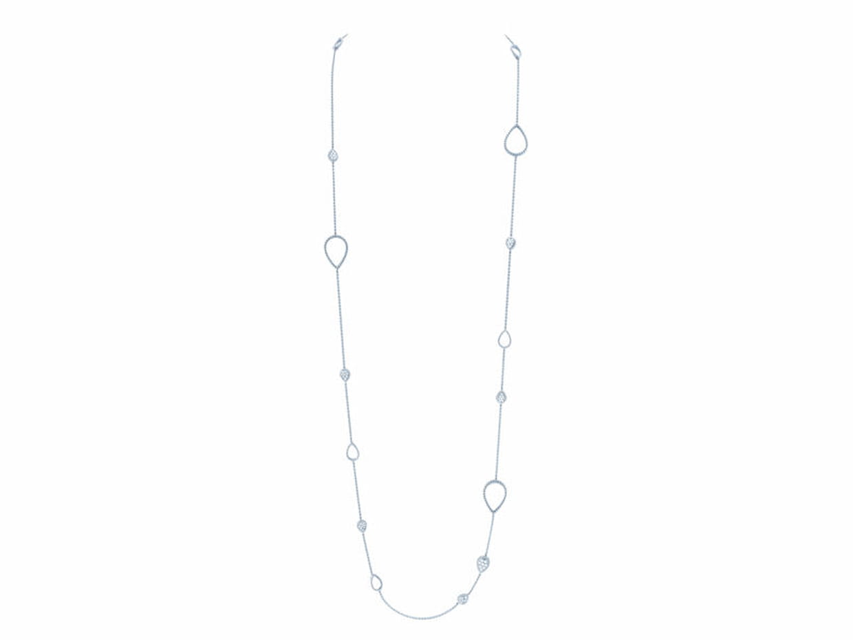 Boucheron sublime le sautoir avec ce modèle en or blanc pavé de diamants. Fluide et précieux, il épouse les mouvements de celle qui le porte avec grâce. (Prix : sur demande. www.boucheron.com)