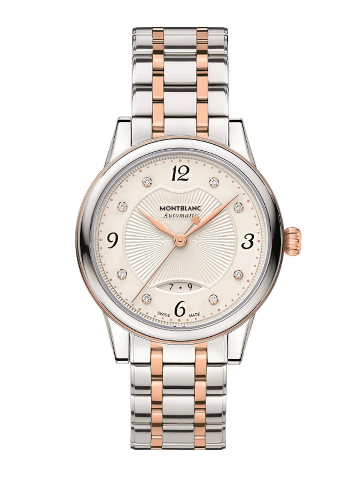 Montblanc propose la montre CollectionBohème - Automatique avec son bracelet en acier et or. Et chez la maison de luxe, tout est dans le détail : cadran à "guilloché" serti de huit diamants et aiguilles "feuille" dorées à l'or rouge. Le boîtier fait 30mm et est en acier inoxydable et or. (Prix : 4.300 euros / www.montblanc.com).