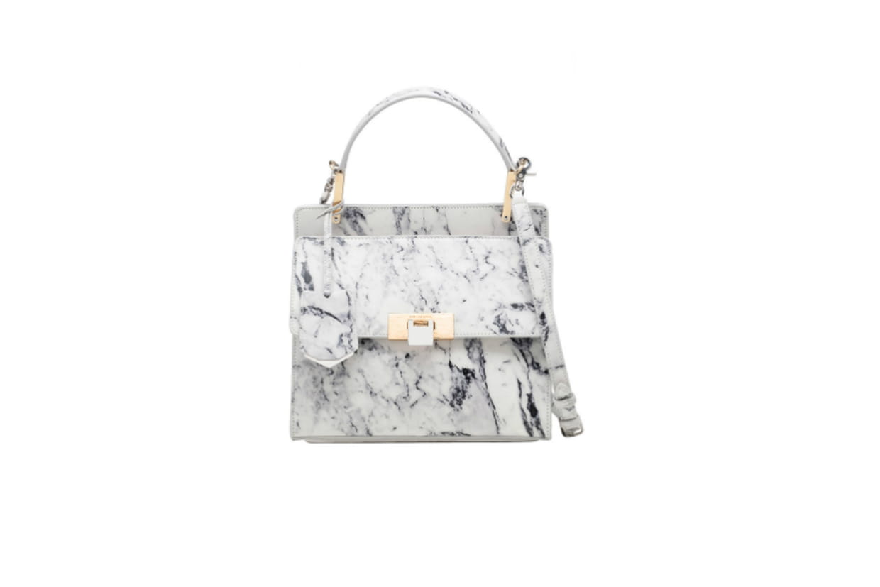 Ce sac carré en format mini se porte aussi bien à la main qu'à l'épaule, grâce à sa bandoulière. Avec son imprimé, ce cartable en cuir de veau lisse ne devrait pas vous laisser de marbre...