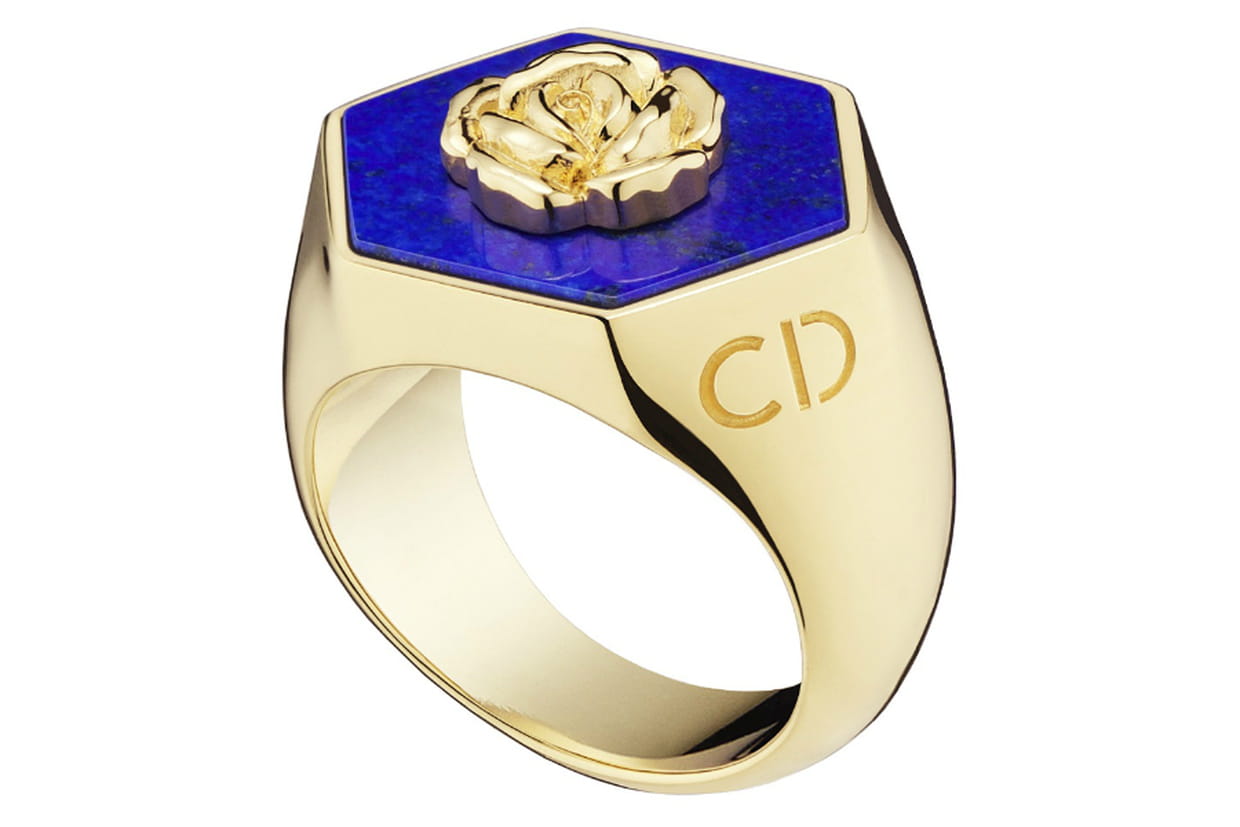 Bague octogonale en métal plaqué d'or avec pierre lapis lazuli et rose de Christian Dior