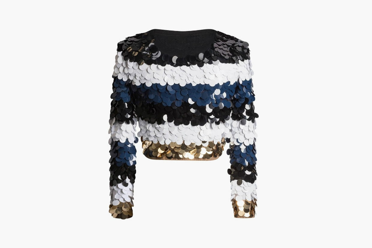 Pull croped à rayures doré, blanc, bleu et noir, brodé de sequins de Sonia Rykiel