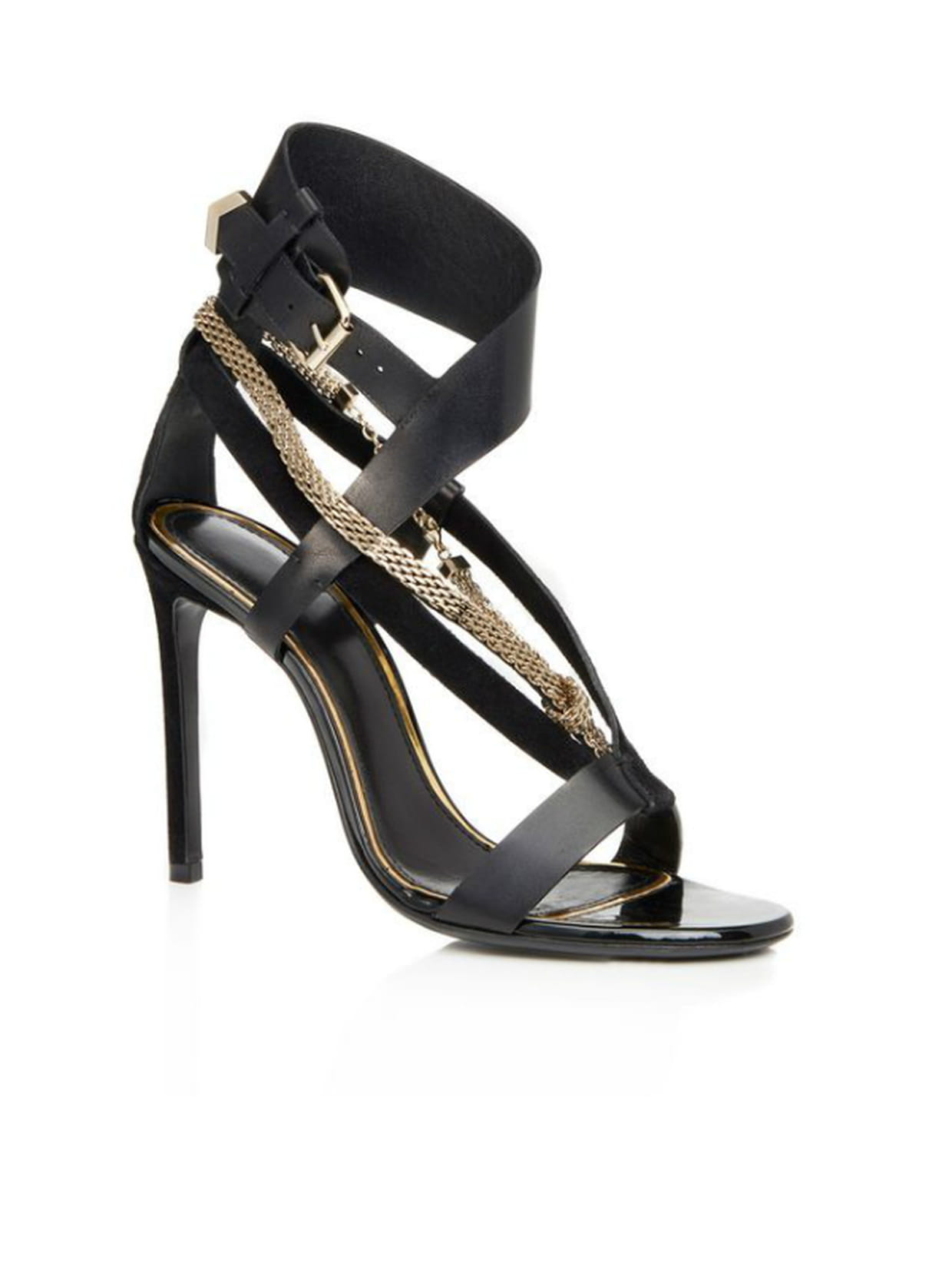 Sandale noire à talon en cuir de veau avec bracelet chaîne cheville finition vermeil de Lanvin