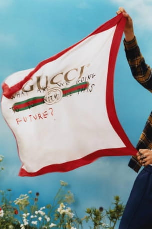 Le message militant se glisse partout cette saison, même au creu de notre cou. Féministe, humaniste selon les griffes, il est simplement sceptique chez Gucci, qui invite la plume de la très branchée photographe Coco Capitán dans une capsule exclusive. Avec son allure de graffiti hâtif et sa teneur anxieuse, le message "What are we going to do with all that future ?" , soit "Qu'allons-nous faire de tout ce futur ?", fait mouche sur la soie de la maison italienne. Carré bourgeois, logo iconique et tag arty, la panoplie de la fashionista engagée est au complet.