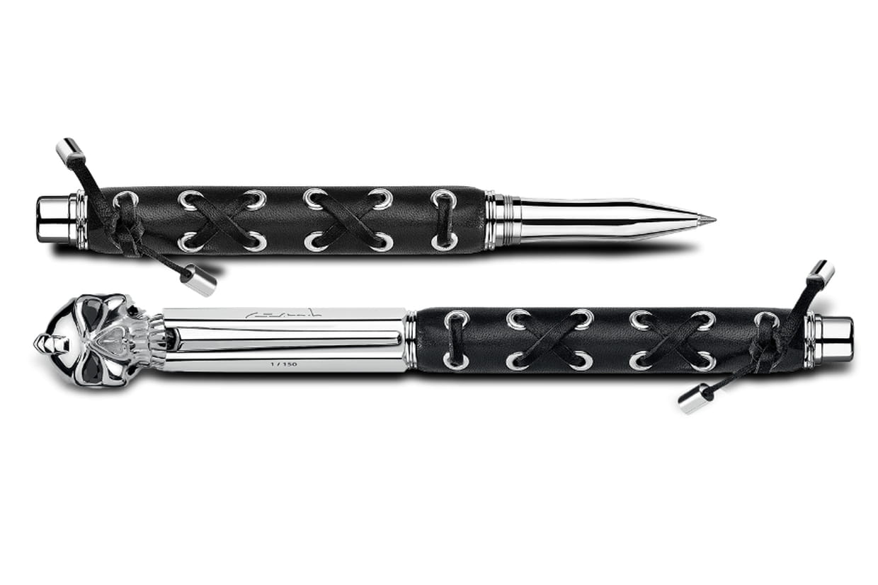 Stylo bille réalisé en partenariat avec l'architecte au style de rockeur Peter Marino. Composé d'un capuchon surmonté d'un crâne argenté aux yeux en onyx noir et d'un corps gainé en cuir de veau français et laçage en cuir à la main de Caran d'Ache