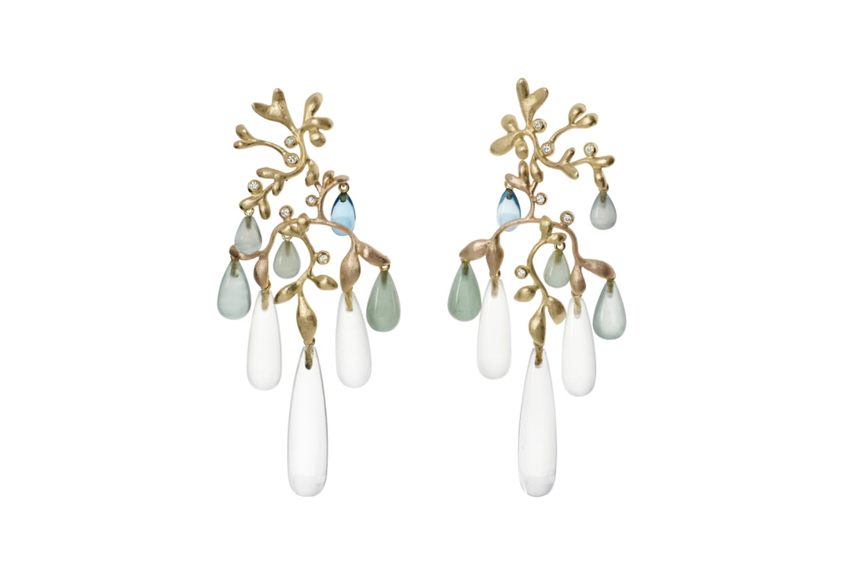 Boucles d'oreilles deux ors gravés quartz rutile, pierre de lune et diamants d'Ole Lynggaard Copenhagen