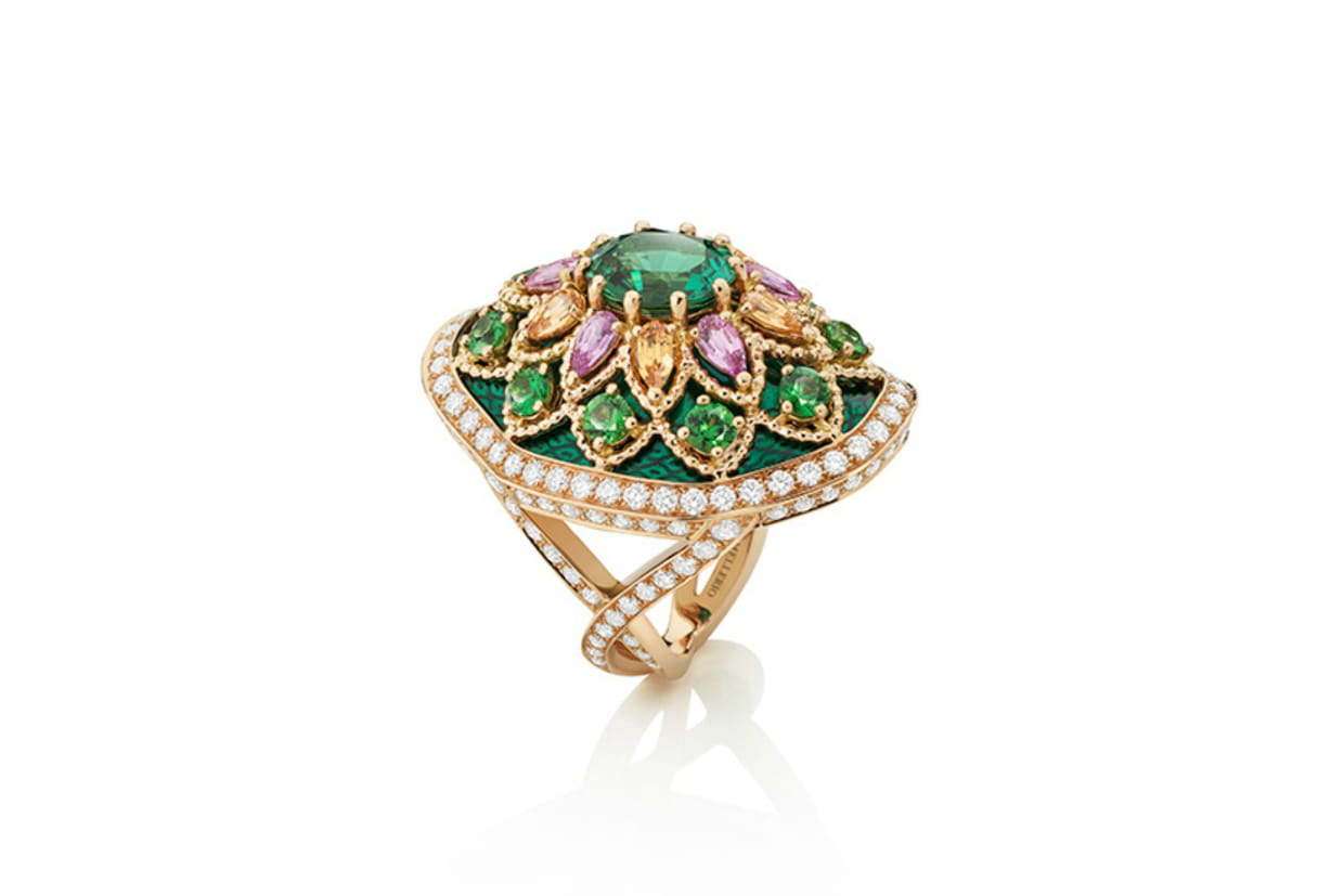 Bague en or rose sertie de tourmaline bleu-vert, saphirs roses, grenats spessartites, tsavorites, diamants et émail guilloché vert de Mellerio