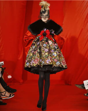 Les arabesques de dentelles et les broderies chères à Christian Lacroix sont bien là, mais cette fois dans des tonalités plus sombres. Telles une procession, dont éclatent çà et là de superbes couleurs vives, les passages ont alterné les courtes robes trapèze et les longues robes feuilletées et bouillonnées. Une collection inspirée du "monde de l'insecte", du propre aveu du couturier, mais dans les tonalités de l'hiver.