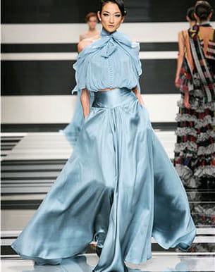 Un véritable paradis de robes du soir et de cocktail pour cette collection signée Elie Saab. On retrouve beaucoup de couleurs, en passant du vert émeraude au rouge ou encore au bleu dur, sans oublier, bien sûr, le classique mais pas moins raffiné noir ou le bleu-gris dans l'air du temps. La preuve avec cette tenue légère et voluptueuse : jupe taille haute en shantung bleu pâle et blouse à jabot et emmanchure américaine en crêpe Georgette. On joue aussi ici majestueusement la carte du nœud et du ruban de satin. Que de délicatesse.