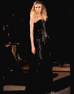 Franck Sorbier revisite les grandes héroïnes tragiques cette saison avec des robes inspirées. Ce modèle "Ondine" est composé de 72 "lamelles algues" picotées machine et découpées à la main en organza satin de soie noire. Cette longue robe-bustier façon "aigle noire" se révèle à la fois mystérieuse et luxueuse pour un résultat envoûtant.
