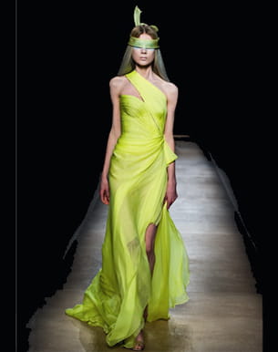 La maison Valentino mise cette saison sur des coloris flashy pour un résultat très original. Ce modèle joue sur les effets drapés et les asymétries pour un résultat presque aérien. Comme cousue à même le corps, cette robe se place directement sous les feux des projecteurs. La magie de la haute couture !