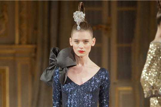 Pour sa haute couture automne-hiver 2012-2013, le créateur envisage la femme comme un bijou. Son show tel un écrin libère alors quelques créatures de rêve, captivantes, scintillantes, dont la lumière révèle les multiples facettes... Zircon, émeraude ou encore améthyste et aigue-marine sont les noms donnés à ses nouvelles robes imaginées pour sublimer les plus précieuses et révéler de sublimes couleurs. Un long et superbe fourreau col haut en jersey-gaine noir ouvre le bal, tout orné de boutons cristaux Swarovski Elements sur le devant, au dos et sur les côtés. Suivent de nombreuses longues silhouettes, toujours aussi attirantes, tantôt en velours de soie, agrémentées d'organza, de dentelle, de perles brodées et de paillettes, tantôt en crêpe comme cette dernière toilette baptisée "Diamant" littéralement constellée de cristaux scintillants. On aime aussi la touche nœud Alexis Mabille sur de nombreuses tenues, ses dos-nus à tomber et quelques pièces courtes en lamé or pâle ou celle en Strech noir recouverte de paillettes. Les manches sont parfois chauve-souris, parfois kimono, et donnent toujours cette originalité et toute l'allure à ces nouvelles silhouettes qui nous rappellent cet esprit couture qu'on aime tant.