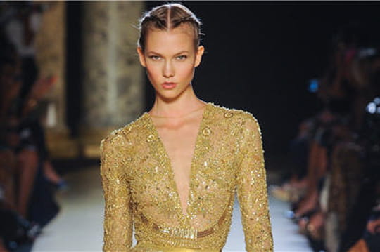 Elie Saab continue de nous faire rêver. Et s'est encore surpassé pour cette nouvelle haute couture. Si tous ses précédents défilés nous avaient marquées et séduites, celui-ci nous a plus que jamais charmées. Tout d'abord, l'inspiration de cette nouvelle ligne. Une collection tournée vers l'Orient, des motifs ottomans s'invitant avec subtilité sur quelques silhouettes comme pour insuffler une richesse impériale à de longues robes et traines. Elles vont du gris fumé au poudre champagne, du rose fondant au bleu paon ou céleste, s'imposent parfois en vieil or et noir de jais. Sublimes. Des guipures, de la dentelle, des broderies, des perles et des paillettes, toujours. Les silhouettes se dévoilent, une à une, et révèlent au fil des passages toujours autant de légèreté et de fluidité, de sublimes couleurs pour l'hiver 2012-2013. Encerclant le poignet comme une manchette et accrochées au cœur comme une broche, des constellations de pierres facettées coulent tout le long de toilettes précieuses. Dans leur suite, des volutes de dentelles et broderies dévorent plastrons et emmanchures, soulignent les tailles et les dos-nus. Quelques volumes en organza de soie piqués d'aplats dorés, plus vaporeux, prennent place avec délicatesse. En final, la robe de mariée. Impériale. Toute en dentelles, riches volutes d'organza fumé gaufré de feuillages en brocard doré. Elle s'anime de reflets argentés et de lueurs chatoyantes avec grâce, la traine n'en finit plus... Et nos yeux n'en reviennent pas non plus. Du grand Elie Saab.