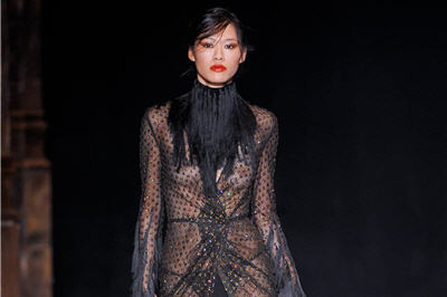 "La nature, ses incrustations et ses métamorphoses." Voilà le programme du défilé haute couture de Basil Soda. Au milieu de colonnes de vieux bois, les créations du couturier libanais prennent toute leur dimension. Les modèles sont presque aériens, drapés dans des robes longues jusqu'à la terre et des dégradés automnaux. La palette choisie par le créateur s'étale du kaki métallisé au noir, en passant par le rouge indien, le rouille et le blanc des premières neiges. La plupart des robes s'offrent une traîne, d'autres se fendent sur le devant, jusqu'à mi-cuisses. Toutes sont très décolletées et se laissent aller à une transparence qui en dit beaucoup.