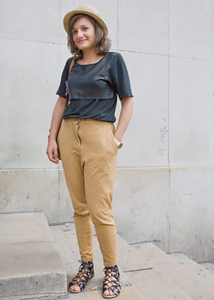 On aime : le chapeau en paille, discret, mais qui donne une petite note ensoleillée à la tenue. Associé au pantalon façon Jodhpur et couleur sable, il nous entraîne littéralement sous la chaleur écrasante du Sahara. A noté aussi, l'originalité du top muni d'une double épaisseur sur la poitrine et des chaussures entrelacées au style très graphique.