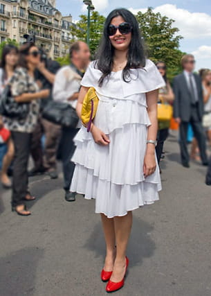 On aime : le volume de cette robe tout en superpositions et légèreté. Les chaussures rouge vif et le sac jaune cassent le côté épuré pour lui apporter plus de peps et de gaité.