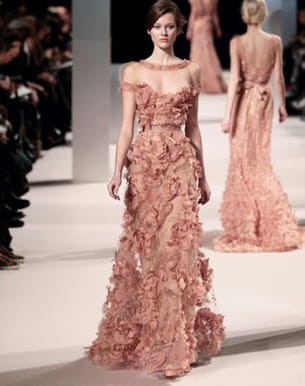 Les dentelles et broderies romantiques ont la part belle ce printemps chez le couturier Elie Saab. Ici, la longue robe de soirée est parcourue de splendides fleurs brodées couleur rose thé. Le large décolleté et le voile transparent subliment la silhouette et invitent à la rêverie... Un bouquet inspiré et vraiment très raffiné !