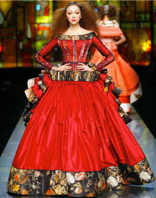 De son côté, John Galliano a convoqué les peintres flamands Vermeer et Van Dyck pour imaginer des silhouettes aux jupes gonflées de couleurs tantôt bleues, tantôt jaunes, tantôt plus profondes. Côté formes, les manches bouffantes arrondissent les épaules, les volumineuses collerettes abondent, tout comme la dentelle blanche qui vient orner les encolures ou les manches. Des tulipes bleues fleurissent sur une robe bustier, évoquant l'éclat de la faïence de Delft. Mais le créateur n'en a pas oublié pour autant les références à Christian Dior dans les jupes amples, les vestes qui marquent la taille, le buste menu qui firent le succès du célèbre tailleur lancé par le fondateur de la maison de couture en 1947.