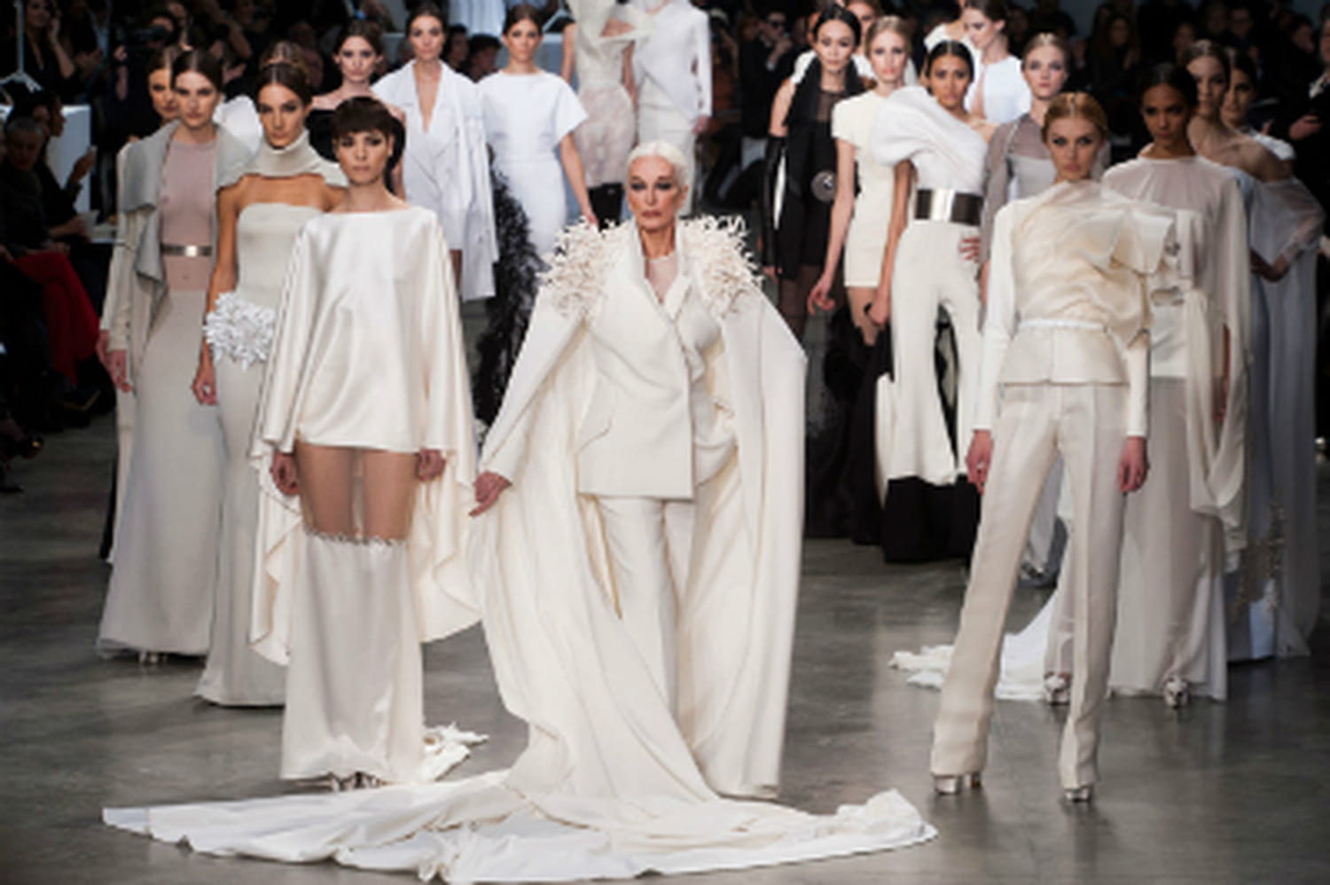 Le blanc est un leitmotiv. Il est agrémenté, sur un modèle uniquement, d'une ceinture d'émeraudes. Il est magnifié par des bandes noires, surtout au bas des robes. Il permet la fluidité du défilé et le développement d'un réseau d'influence artistiques. Les mannequins sont des anges modernes et leurs ailes prennent la forme de capes en soie transparente ou en satin. Mais les modèles incarnent aussi paradoxalement des femmes fatales. Les jambes apparaissent et disparaissent sous les fentes, les décolletés plongent sur les poitrines et pas seulement. Lorsque les mannequins nous tournent le dos, c'est un second enchantement. Il est traversé par de bandes de satin noir ou blanc. La peau apparaît comme partie intégrante des robes et des combinaisons. Les modèles se succèdent et diffusent une atmosphère où seule règne la légèreté. Jusqu'au grand final... Habillée d'un tailleur blanc cassé surmonté d'une longue cape et d'un col évoquant un banc de corail immaculé, une femme d'une beauté mûre et hypnotisante, traverse le podium, avec froideur et majesté.