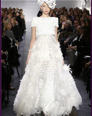 Blanc immaculé, petites épaulettes, plumes et coiffure stylisée, l'art pointu de la haute couture se manifeste ici même. Un travail dans les moindres détails et un résultat ultra sophistiqué. L'emblématique couturier de Chanel, Karl Lagerfeld, touche une nouvelle fois à l'extrême limite de la Mode avec un grand " M ". Sublimissime !