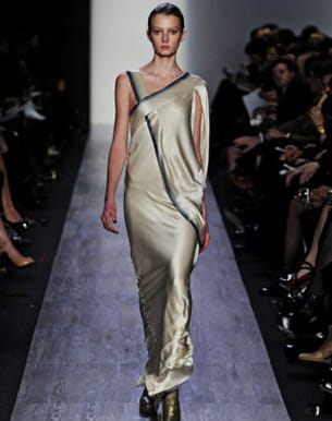 Epurée, cette robe s'inspire directement des tenues antiques. La soie beige dévoile légèrement la peau dans un effet d'asymétrie subtilement relevé par un filet bleu. Semblant cousu à même le corps, ce modèle réinvente la féminité.