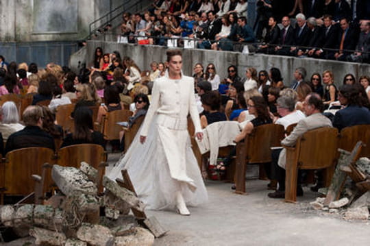 Transformation théâtrale au Grand Palais. Sous la nef de l'édifice parisien, c'est un décor de salle de spectacle en ruine qui remplit l'espace. Des murs décrépis, de vieux sièges en bois, des éboulements à quelques endroits et un paysage futuriste en arrière plan de la scène. Une catastrophe ? Non, la magie du défilé Chanel haute couture, orchestré par un Karl Lagerfeld en grande forme.