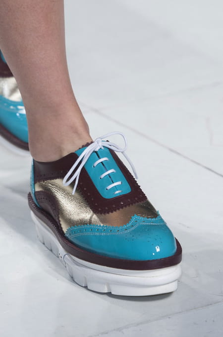 Alors que l’an dernier, il optait pour un "tricolore" jaune, vert et fuchsia avec semelle noire, cette saison, les souliers lacés signés Fournié sont plus estivaux avec leur semelle blanche. Quant aux trois couleurs utilisées, elles reprennent la palette chromatique "fil rouge" de la collection, à savoir le henné, le turquoise et le doré : une perfection.