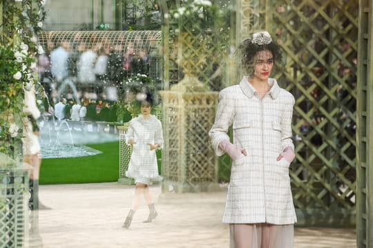 C'est une fois encore au Grand Palais que Karl Lagerfeld a convié le public dans son jardin français où des treilles couverts de roses encerclaient une fontaine centrale. La maison de couture nous a proposé un défilé haute couture ouvertement printemps-été de par sa scénographie avec, en fil rouge, les roses/le rose . Dans le décor, elles sont fraîches et blanches, synonymes de pureté et de charme, mais aussi roses, représentant la féminité, l'élégance et le raffinement. Le rose s'invite jusqu'aux lèvres des mannequins. Poudré, pastel, saumon ou fuchsia, la couleur est utilisée dans tous ses états au fil de la collection, tout comme le blanc. Ils apportent ensemble lumière et gaieté pour un show des plus rafraîchissants.