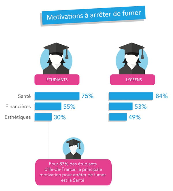 Quelles sont les raisons qui motivent les jeunes à ne plus fumer ? Les adolescents sont de plus en plus soucieux de leur santé. Ils boivent moins, fument moins, font plus de sport que leurs aînés... La préservation de leur hygiène de vie est d'ailleurs l'une des principales raisons invoquées pour arrêter la cigarette (pour 75 % des étudiants et 84 % des lycéens). Ils font également un peu plus attention à leurs dépenses et à leur apparence. Ainsi, les raisons financières (55 % et 53 %) et les conséquences esthétiques que le tabac peut engendrer (dents jaunes, mauvaise haleine...) pour 30 % des étudiants et 49 % des lycéens, les motive à ne plus toucher au tabac dans les prochains mois.