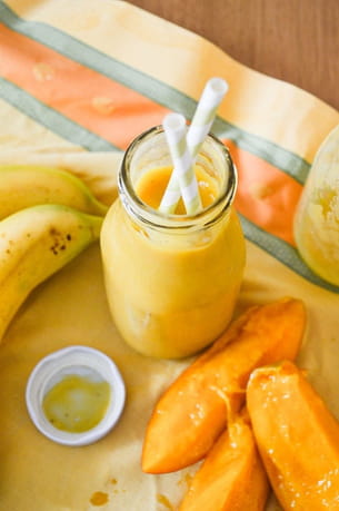 Coupez une mangue et demi et deux bananes en morceaux, ajoutez 30 cl de jus d'orange et une tasse d'eau dans votre mixeur, et mixez le tout à puissance maximale pendant quelques minutes. Ce délicieux nectar de fruits exotiques ravira les enfants, dès un an.