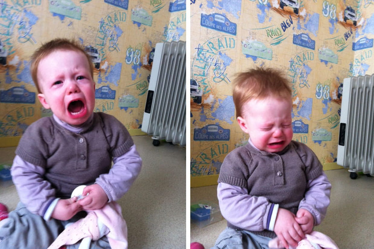 Cloé, 1 an, pleure à chaudes larmes car elle a mal aux dents.